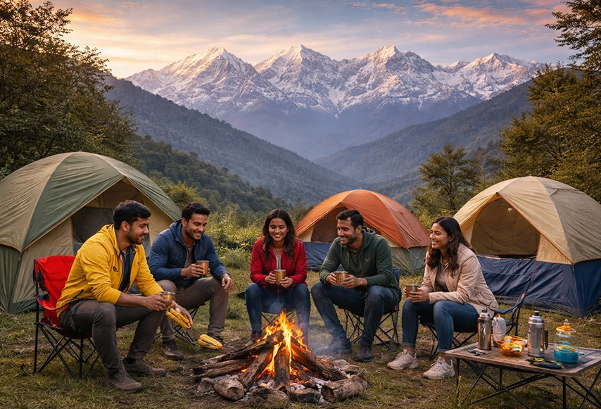 Camping options provide bonfire nights, Himalayan sunrise views, and outdoor experiences.