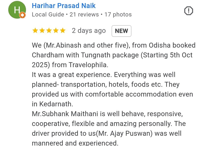 โ€œIt was a great experience. Everything was well planned โ€” transportation, hotels, food, and service. Even Kedarnath accommodation was comfortable. Mr. Subhank Maithani is cooperative, flexible, and amazing personally. The driver provided was well-mannered and experienced. We highly recommend Travelophila.โ€